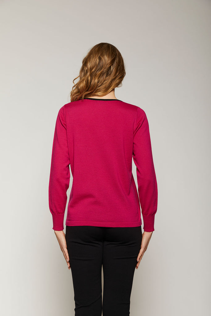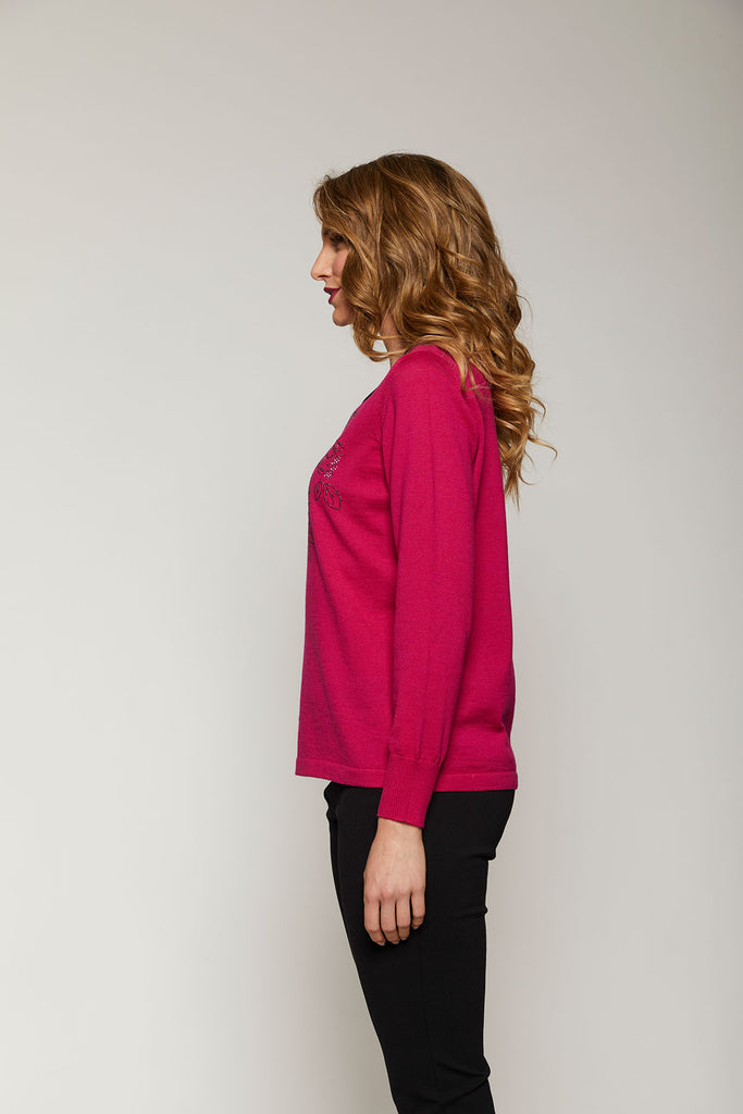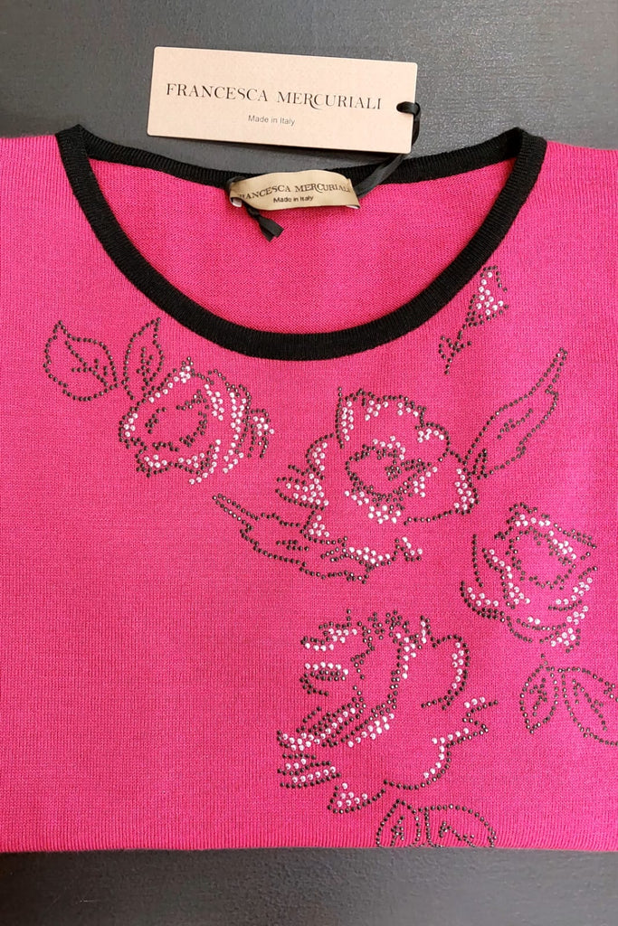 Maglia girocollo in pura lana merinos, profilata in contrasto per un tocco di stile. Arricchita da una grande applicazione di borchie a forma di fiori, aggiunge un elemento di originalità e raffinatezza al tuo look.