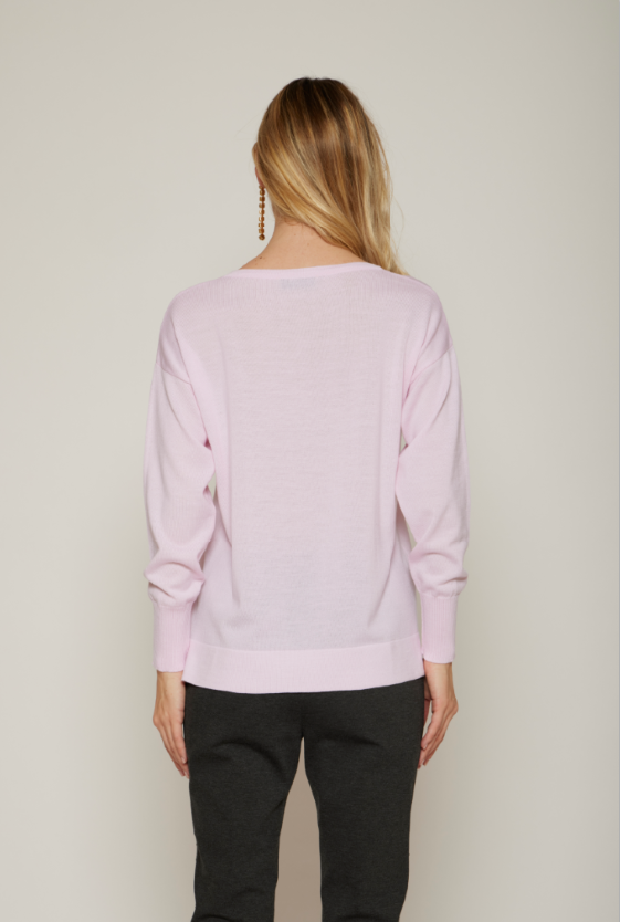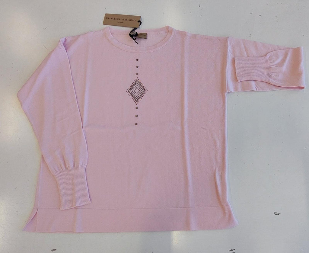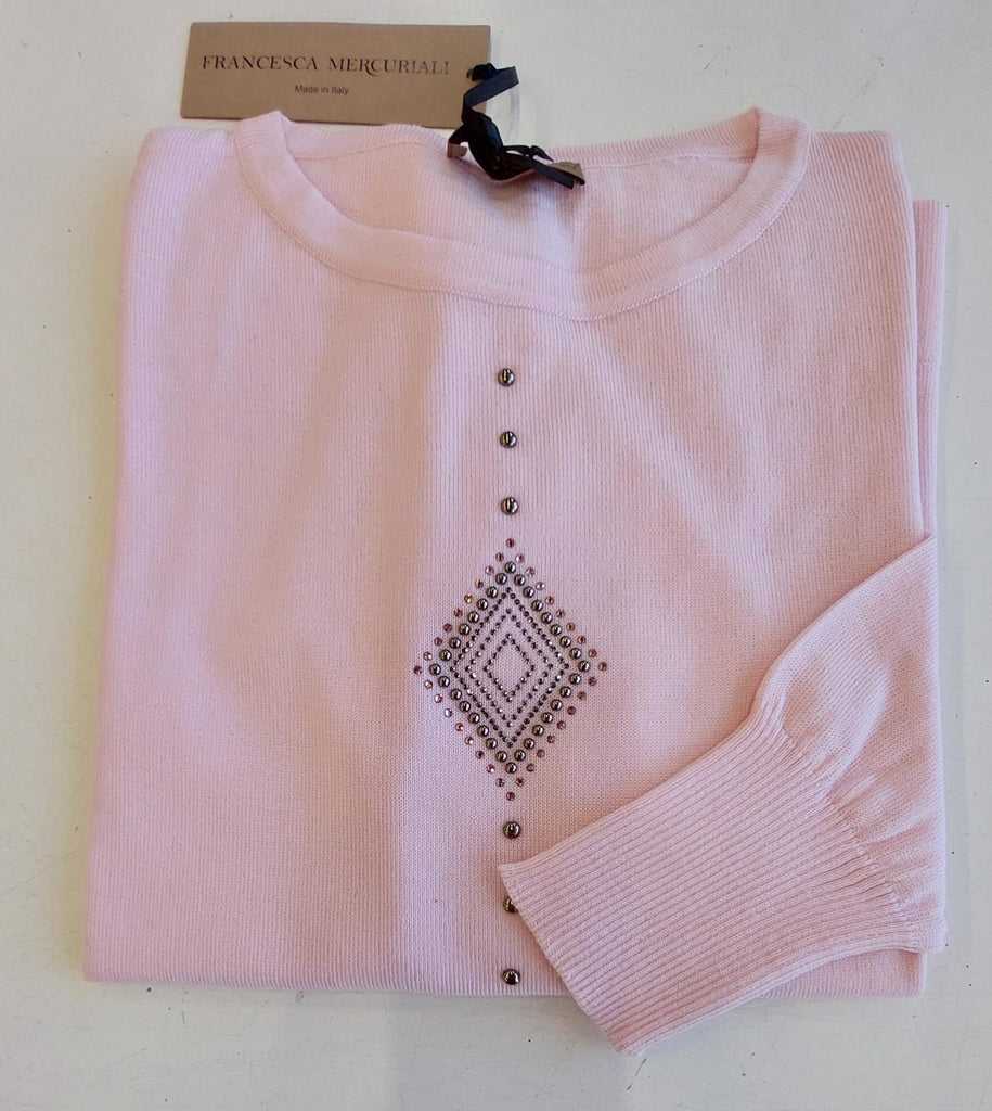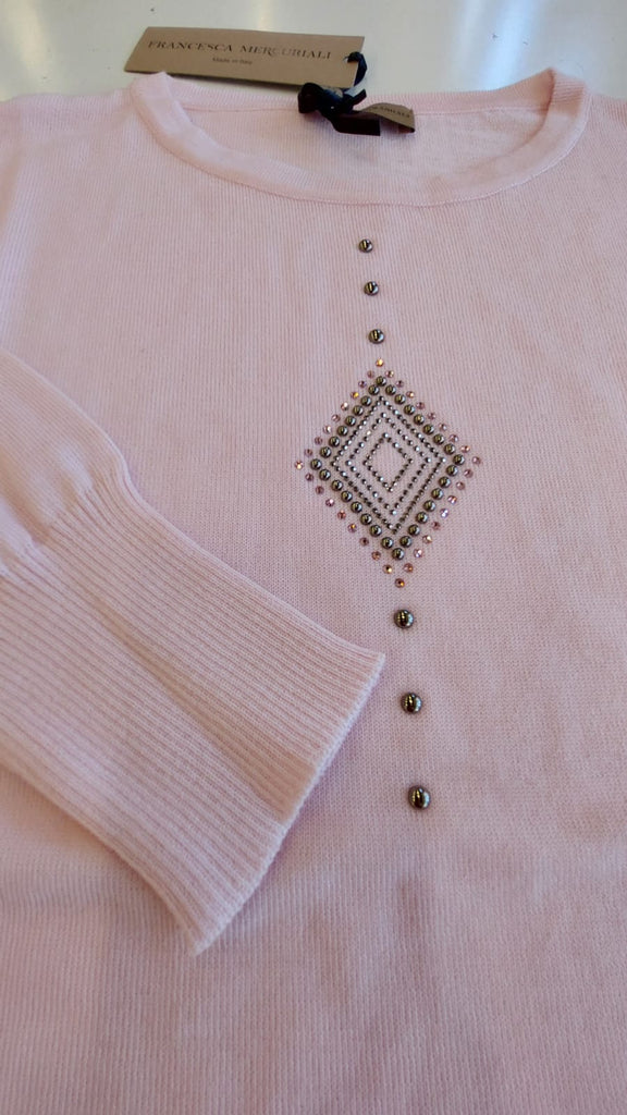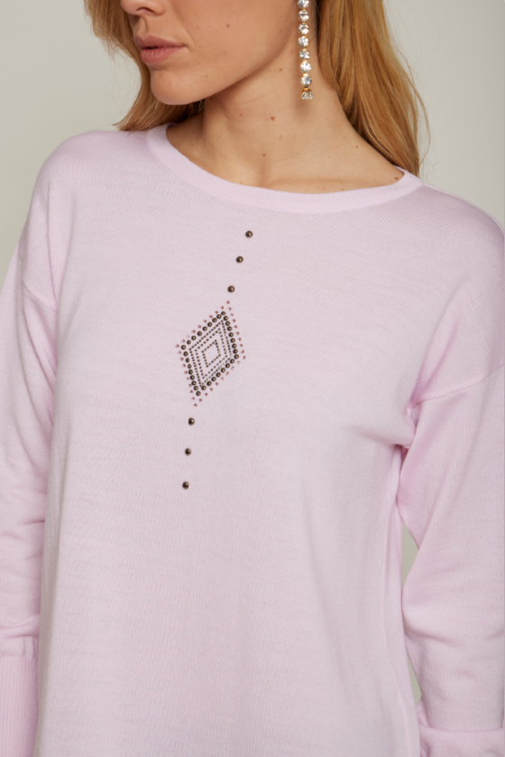Maglia in pregiata lana merinos extrafine, arricchita da applicazione di strass e borchie con disegno e rombo sul favanti . Vestibilità comoda cn spacchetti sui fianchi e polsini in costina, cucitura delle maniche leggermente scesa.