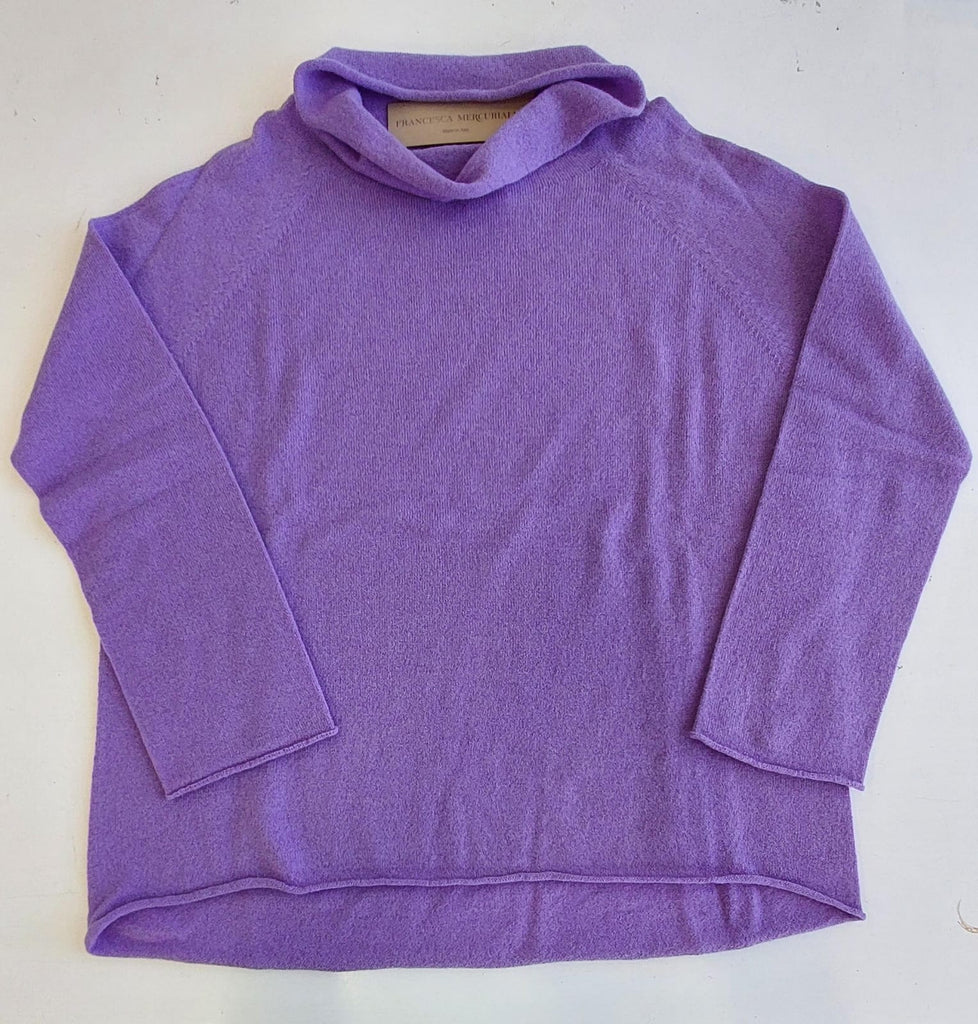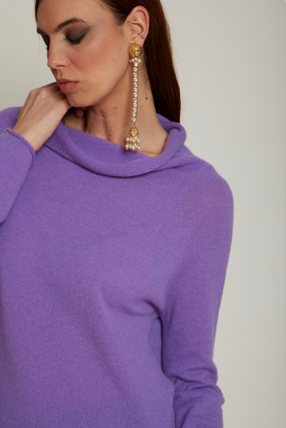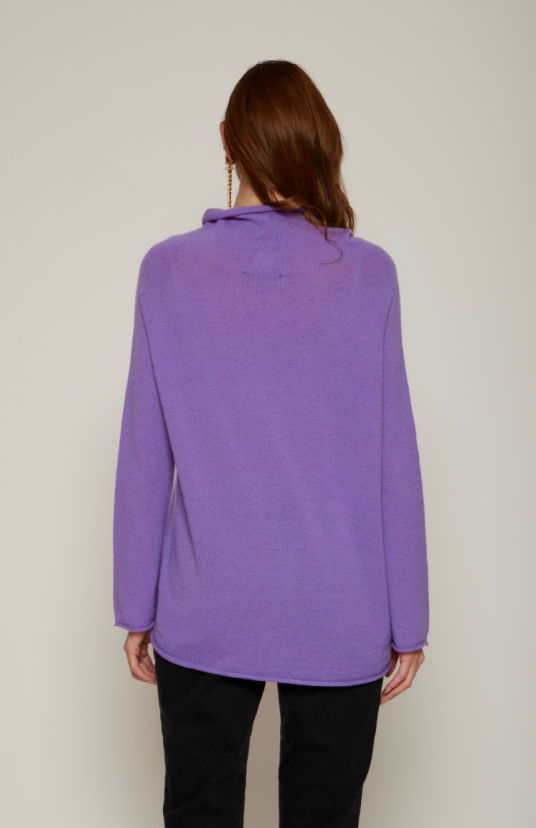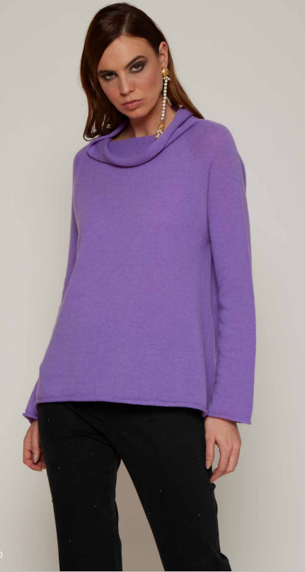 Maglia in filato pregiato lana+cashmere, lunga sui fianchi , maniche morbide con raglan , rifinitura con rollè effetto taglio vivo. Al tatto una vera coccola da portare tutto il giorno.